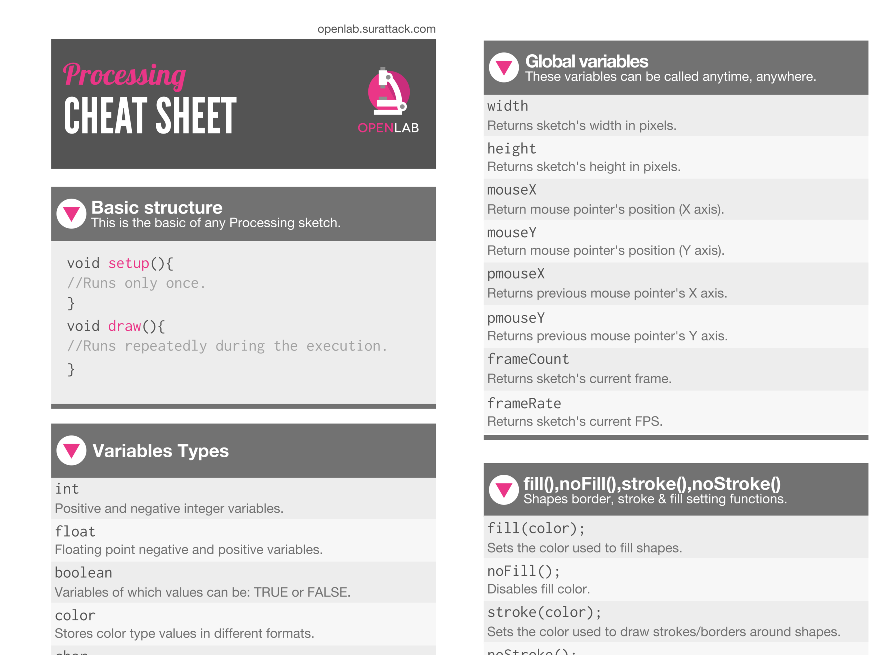 Surattack.com’s Processing Cheat Sheet — this is the one that was handed out in IxLab class.