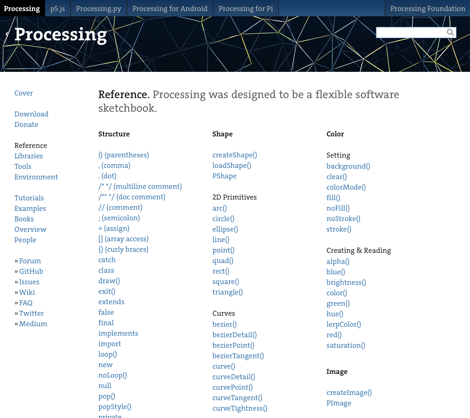 Processing Reference. Also available from inside the Processing app, via the menu item Help > Reference.
