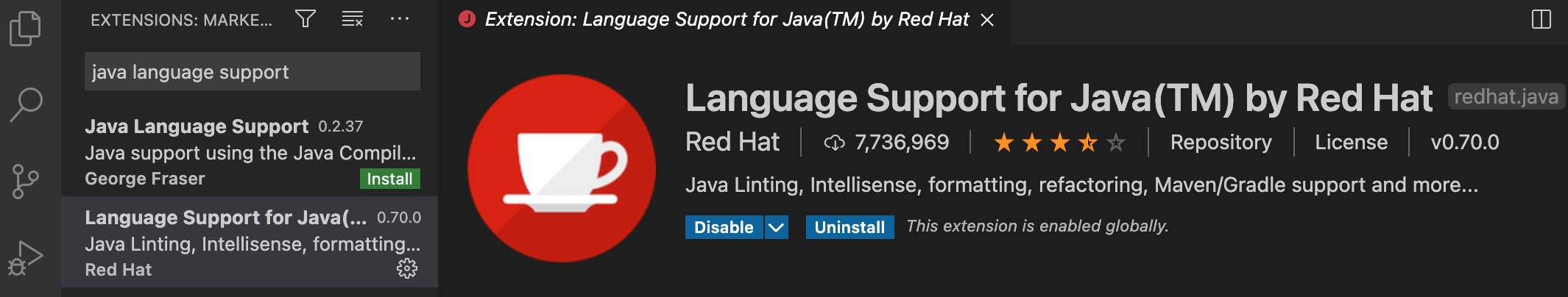 Once installed by using, the pane in Visual Studio Code should show the “Disable” and “Uninstall” buttons. (Don’t click on either one! We want to keep it installed.)