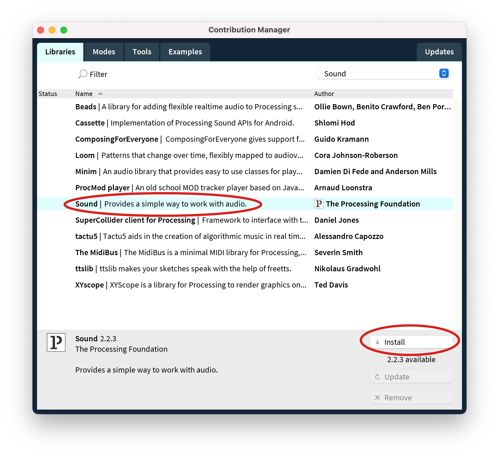 Select the Sound library from the list of libraries, and click Install