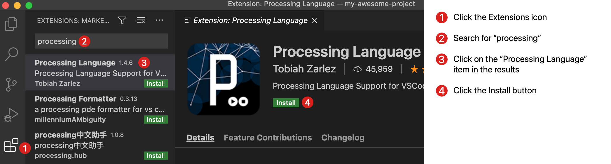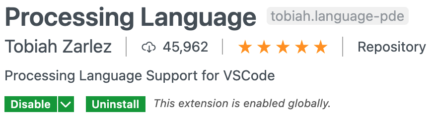 Method 2: Searching for the extension. Open Visual Studio Code. In the Visual Studio Code action bar (on the left), click the Extensions icon. Search for “Processing”. Click the “Processing Language” item in the results. Click on Install.